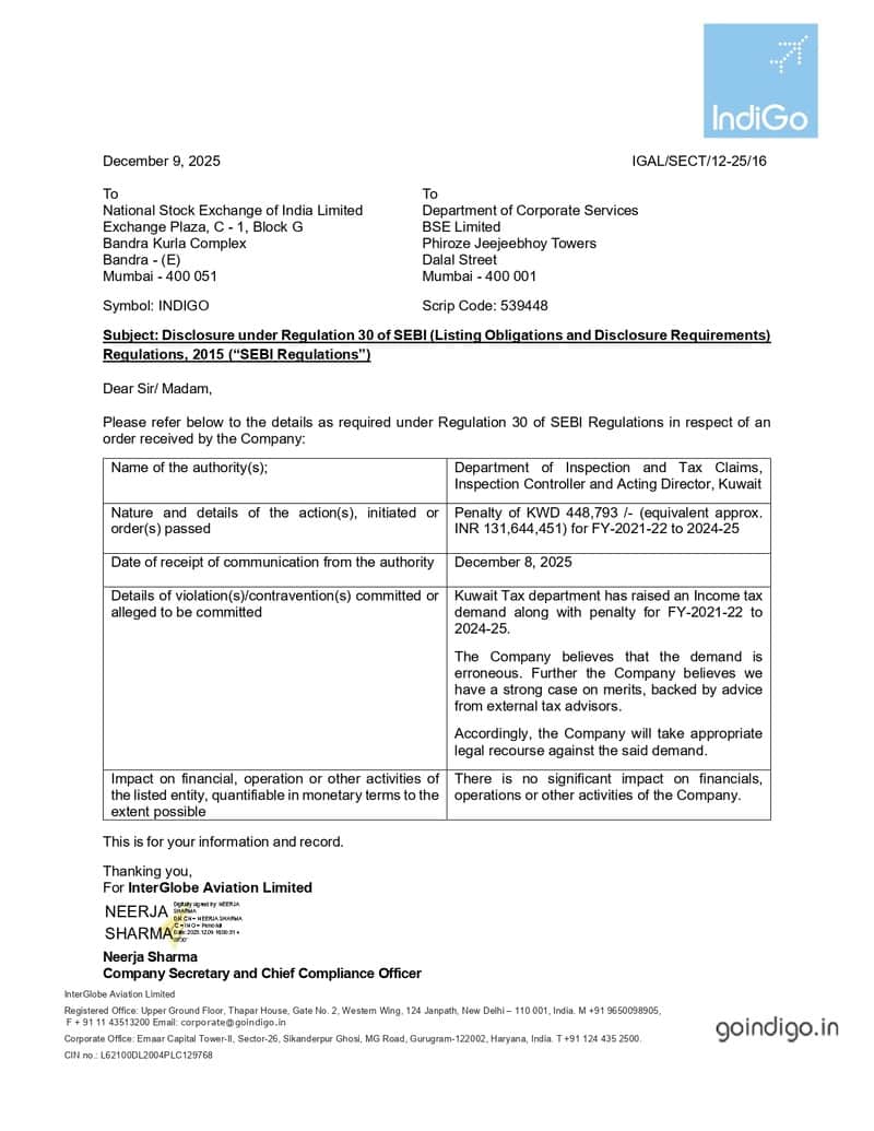 IndiGo Airline‘s parent company, InterGlobe Aviation Limited disclosed it received an income tax demand and penalty order of KWD 448,793 (INR 13.16 crore) from Kuwait’s Department of Inspection and Tax Claims for assessment years 2021–22 to 2024–25.