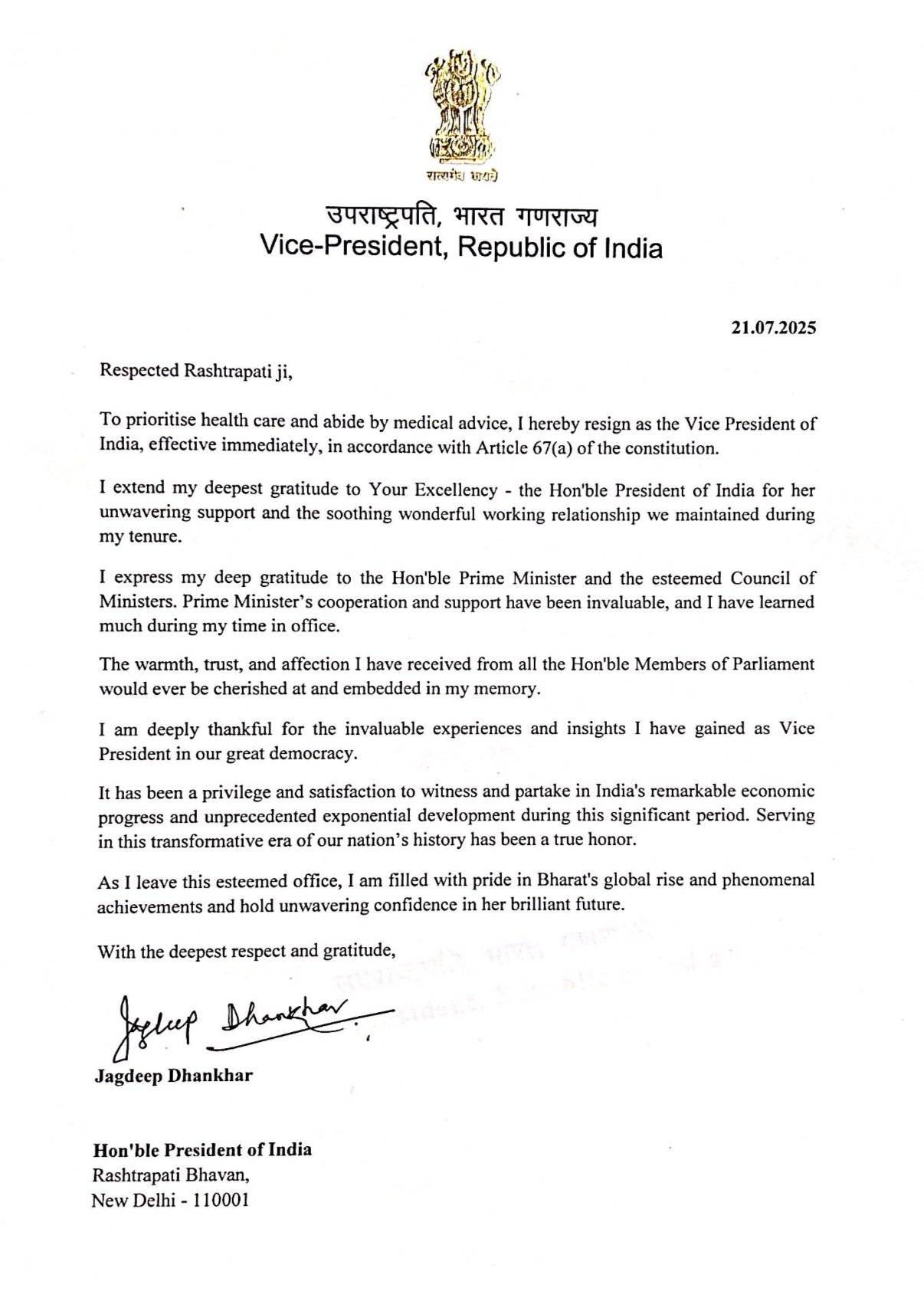 In a letter to President Droupadi Murmu, Dhankhar invoked Article 67(a) of the Constitution, which allows a Vice President to step down by submitting written notice. He didn’t share any details about his condition or name a specific illness.