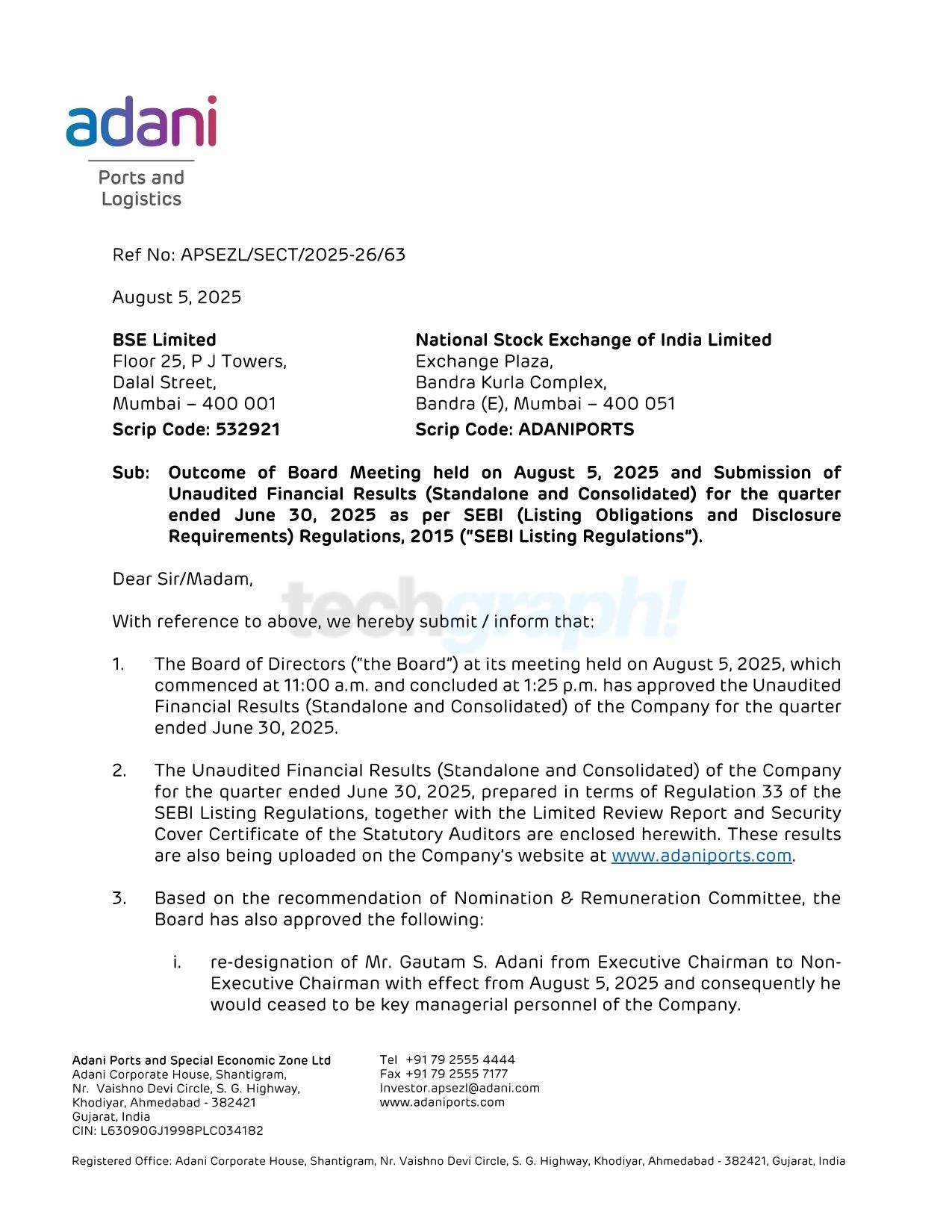 Adani Ports and Special Economic Zone Ltd. (NSE: ADANIPORTS) Chairman Gautam S. Adani has been re-designated as Non-Executive Chairman, the company said in a regulatory filing dated August 5.